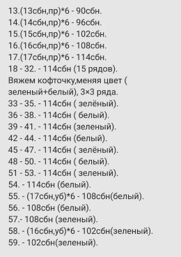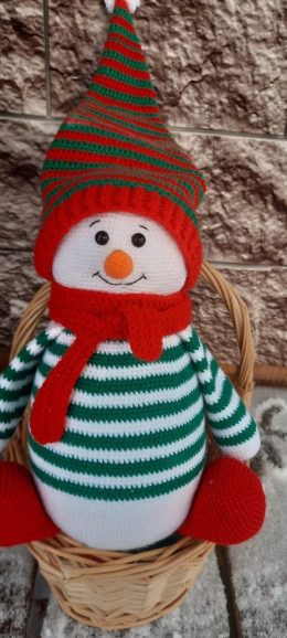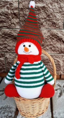 Знаете ли вы, что снеговики могут быть не только зимними, но и уютными? Этот милый снеговик-амигуруми одет в полосатый свитер, в котором чередуются зеленые и белые полосы, и ярко-красный шарф. Его шапка с длинным конусом добавляет забавную нотку, а оранжевый нос-морковка придает очаровательный акцент.