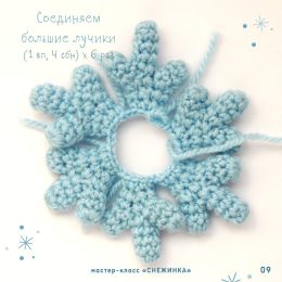 Затем соединяем все 6 лучиков. Вяжем один ряд: (1 вп, 4 сбн по лучику) х повторяем 6 раз. Нить отрезаем.