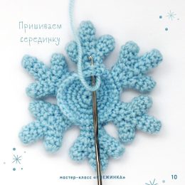 Сшиваем крючком швом через край сперва один кружок петля в петлю. Затем с обратной стороны пришиваем второй круг. Серединку снежинки набиваем. Лучики я не набивала.