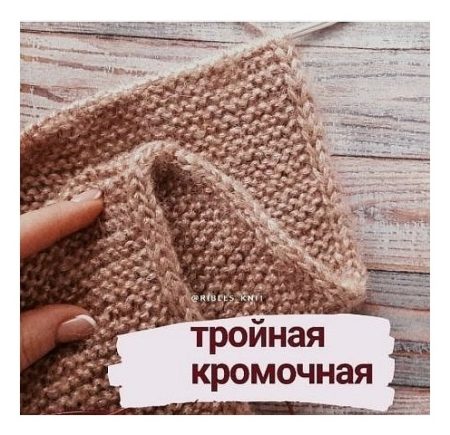 Способ вязания тройного кромочного края, который создаёт рельефный и объёмный эффект. Этот приём часто применяется в процессе создания шарфов и снудов, а также для оформления планки полочек, V-образных вырезов горловины, пройм, воротничков и других элементов. Раппорт составляет всего один ряд.