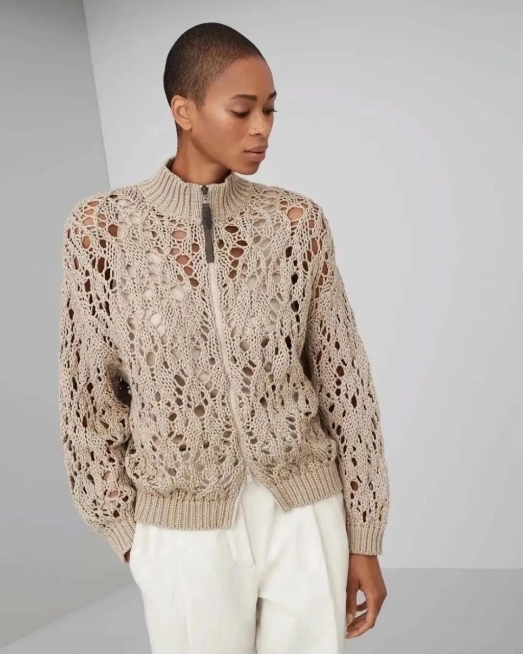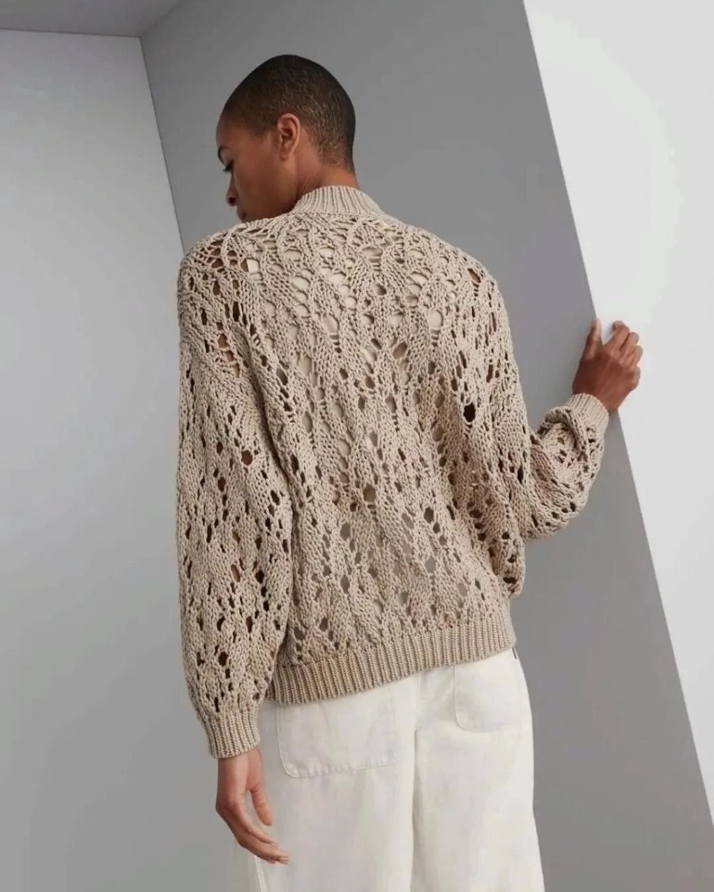 Стильный вязаный бомбер с ажурными узорами и объемными рукавами