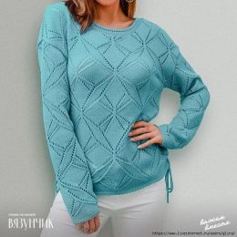 Здравствуйте, дорогая! Как Вам этот чудесный свитер? Такой воздушный, как легкое облачко в летний день. А эти ажурные ромбы — настоящая изюминка, не правда ли? И посмотрите, как игриво завязывается сбоку!