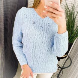 Нежно-голубой оттенок свитера резко контрастирует с его сложной вязкой. Объемные узоры и ажурные детали придают изделию уникальный шарм, а мягкая текстура делает его невероятно уютным.