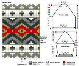 Вязанный свитер с заметным контрастом между серым фоном и яркой красно-белой полосой. Узор в виде зигзагов и снежинок придаёт изделию уютный и праздничный вид.