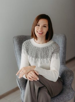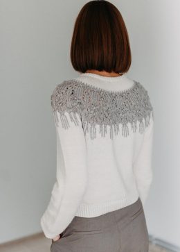 Тёплый и уютный свитер с изящным ажурным узором по плечам, который придаёт изделию особую нежность и стиль. Идеально для холодных дней и приятных встреч.