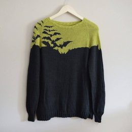 Этот свитер словно создан для тех, кто любит носить настроение на рукаве — или на груди! Уникальный контрастный узор с летучими мышами, взлетающими с плеча, придаёт изделию загадочный и дерзкий характер. Мягкая вязка и аккуратный круглый вырез делают его удобным и стильным выбором для прохладных вечеров.