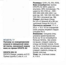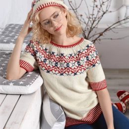 Свободный свитер с короткими рукавами украшен красно-синим орнаментом в стиле фольклорных мотивов на светлом фоне. Особенность модели — контрастные полосатые ма...