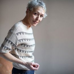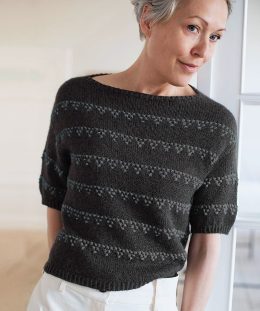 Уютный джемпер с короткими рукавами и оригинальным узором из мелких треугольников, создающих ритмичные горизонтальные полосы. Модель выполнена спицами из мягкой...