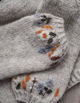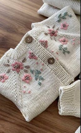 Тёплый вязаный жакет из мягкой пряжи украшен изящной вышивкой с цветочными мотивами и деревянными пуговицами, придающими изделию особый шарм и неповторимость. Н...