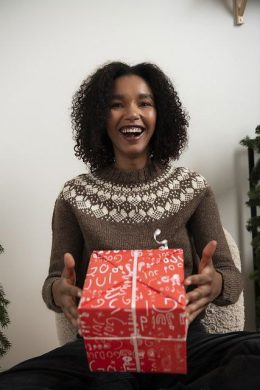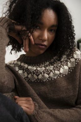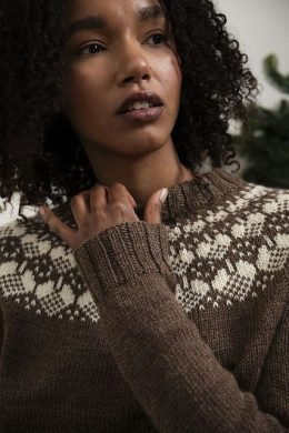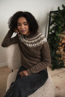Теплый свитер, связанный спицами из мягкой пряжи с традиционным скандинавским узором по круглой кокетке. Особенность модели — контрастный белый орнамент на коричневом фоне и плотная резинка на манжетах и воротнике, обеспечивающая комфорт и тепло.