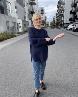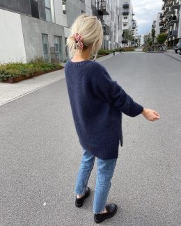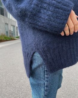 Объемный темно-синий свитер из мягкой пушистой пряжи с удлиненной спинкой и боковыми разрезами, создающими свободный силуэт. Уникальная вязка придает изделию выразительную фактуру, а глубокий насыщенный цвет идеально сочетается с джинсами и кожаными лоферами. Идеальный выбор для комфортного и стильного повседневного образа в прохладную погоду.
