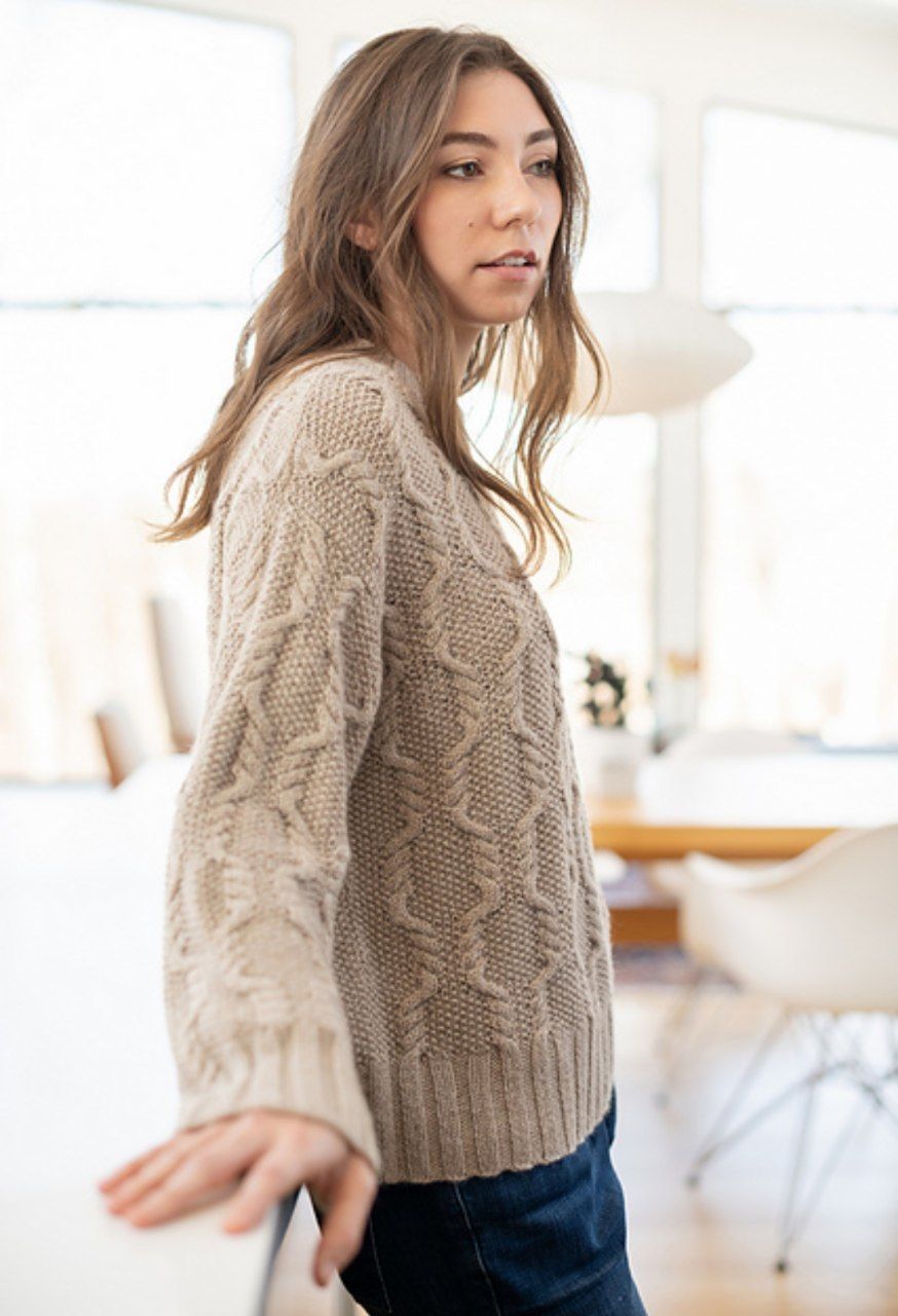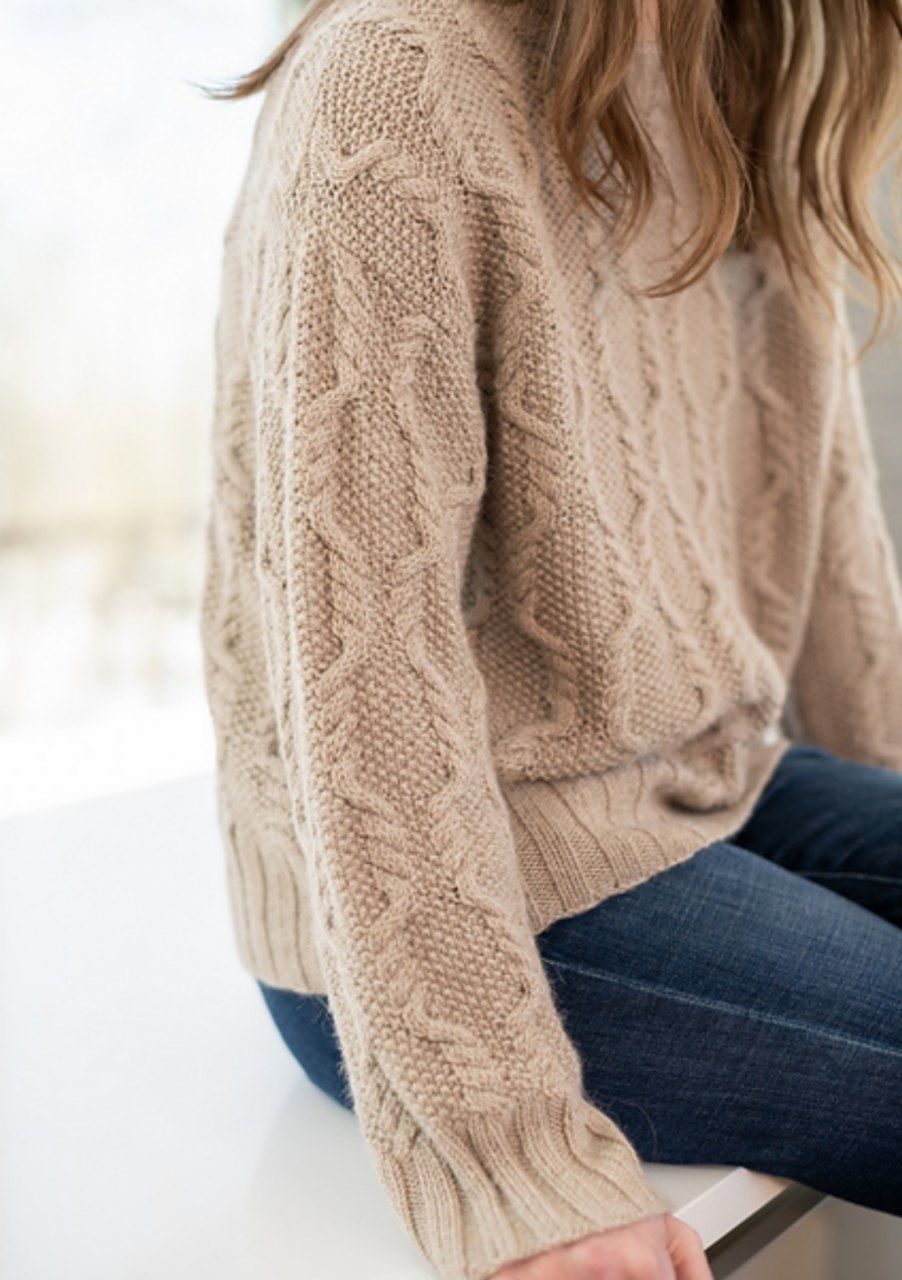 Стильный джемпер с косами. Окончательная окружность груди 115.5 (136, 156, 176.5, 197)см. Окончательная окружность бедер 110.5 (131, 151, 171.5, 192) см. ПРЯЖА: