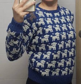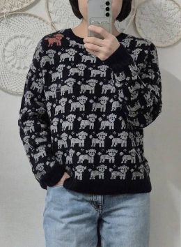 Уникальный вязаный свитер с игривым дизайном, украшенный множеством маленьких котов. На тёмно-синем фоне серые и один красный кот создают забавный контраст, придавая изделию индивидуальность. Свитер выполнен в свободном фасоне, идеально подходящем для комфортного повседневного образа. Ручная работа и оригинальный стиль делают его отличным выбором для любителей необычных вещей.