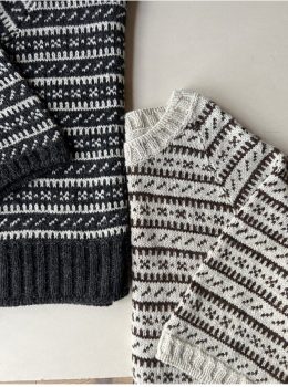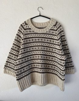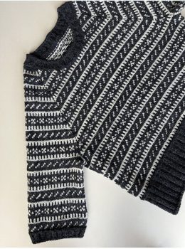 Теплый свитер, связанный спицами из мягкой пряжи с традиционным жаккардовым узором в черно-белой гамме. Особенность модели — широкая резинка по низу и рукавам, создающая уютный и стильный силуэт.