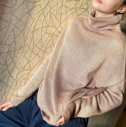 Его свободный крой создает эффект драпировки, а длинные рукава добавляют элегантности. Теплая текстура и пастельный оттенок делают его универсальным выбором для холодного времени года.