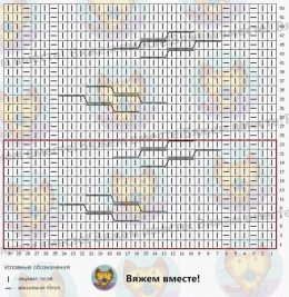 На моей схеме раппорт узора равен 30 петлям по ширине, включая две петли лицевой глади основного полотна с каждой стороны, и 24 рядам по высоте.
