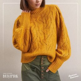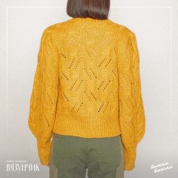 Этот уютный свитер прячет в себе неожиданный элемент — стильные пуговицы на рукавах. Яркий горчичный цвет и узор «ромбы» делают его настоящим шедевром рукоделия.