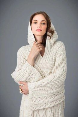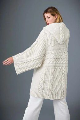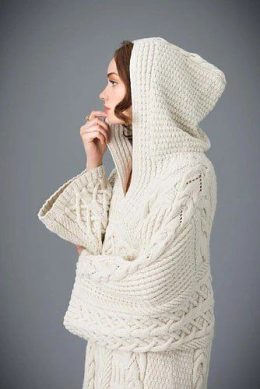 Вспоминая, как бабушка вязала свитера, сидя у камина, этот кардиган с капюшоном мгновенно возвращает в детство. Объемные косы и замысловатые узоры, напоминающие хрустальные снежинки, создают впечатление настоящего шедевра рукоделия. Просторные рукава добавляют свободы движениям, а мягкая текстура согревает лучше любого пледа.