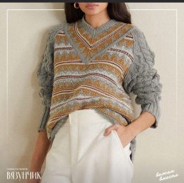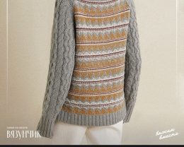 История вязания берет свое начало в древности, когда люди впервые научились создавать теплую одежду из шерсти. Этот свитер, с его сложным узором и сочетанием серого и горчичного цветов, напоминает о классических традициях. Особое внимание привлекают косы на рукавах и геометрический орнамент, которые придают изделию уникальность и стиль.