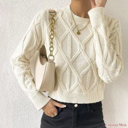 Посмотрите на этот уютный свитер, связанный спицами! Его изысканный геометрический узор и мягкий кремовый цвет привлекают внимание. Золотая цепочка на сумке замечательно дополняет образ, придавая ему элегантности. Что думаете о таком сочетании?
