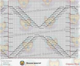Раппорт узора весьма масштабный и равен 40 петлям по ширине и 74 рядам по высоте полотна (выделен красной рамкой на схеме).