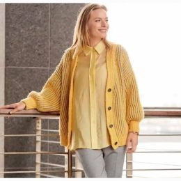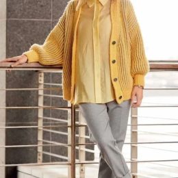 Свободный кардиган крупной вязки с выразительной фактурой и глубоким желтым оттенком. Модель украшена контрастными темными пуговицами, которые подчеркивают стил...