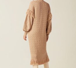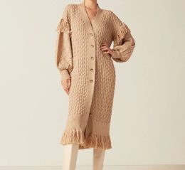 Эффектный кардиган из плотного вязаного полотна с выразительными объемными рукавами, украшенными узорчатой вязкой и крупными кистями. Модель сочетает в себе кла...