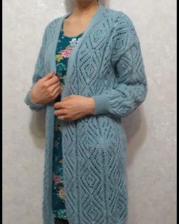 Объемный кардиган из натуральной пряжи с изысканным ажурным вязанием, создающим легкую и воздушную текстуру. Уникальные мотивы с геометрическими элементами и кр...