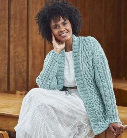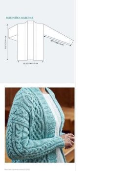 Этот кардиган выполнен из мягкой пряжи нежного голубого оттенка, что придает изделию легкость и воздушность. Особенность модели — сложный узор из объемных кос и...