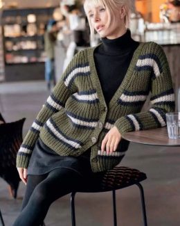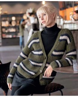 Этот вязаный кардиган выполнен из плотной пряжи с выразительной фактурой, создающей объемный эффект. Уникальная цветовая гамма — оливковый с черными и светло-се...