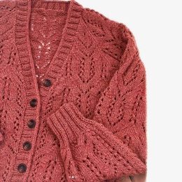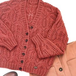 Объемный кардиган насыщенного терракотового оттенка выполнен из мягкой пряжи с выразительным ажурным узором, создающим эффект легкой воздушности. Рельефные лист...