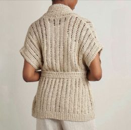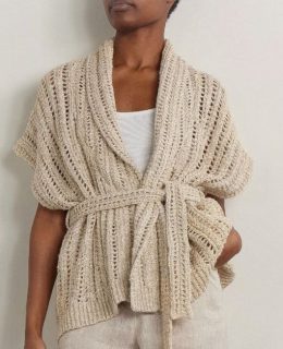 Уникальная вязка с вертикальными и горизонтальными линиями, аккуратный пояс из той же пряжи для подчеркнутой талии, уютный мягкий воротник-шалька, создающий эфф...