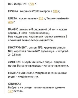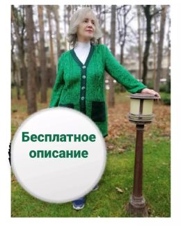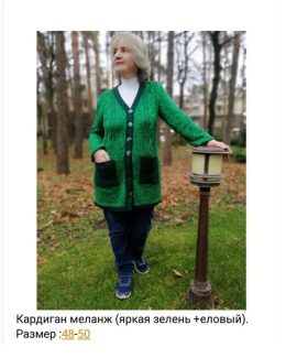 Изделие выполнено из мягкой пряжи насыщенного зеленого цвета с темно-зелеными деталями по краям и крупными пуговицами. Особенность — глубокие накладные карманы...