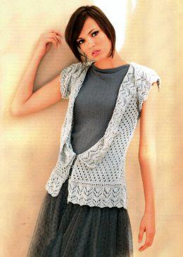 Ажурная кофточка — писк летнего сезона. Выполненная из светло-серой пряжи, в составе которой шелковая и хлопковая нити, эта ажурная кофточка станет любимым пред...
