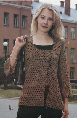Удлинённый жилет в полоску выполнен крючком прозрачным филигранным узором. Дополнительный эффект создаёт связанная крючком кайма с петлями. Размеры 36/38...