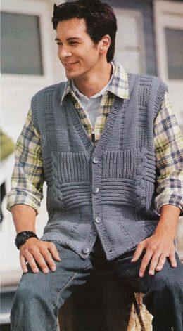 Мужская безрукавка. Благородный консерватизм Размеры:46-48 Вам нужно : 300 г акриловой пряжи средней толщины цвета лаванда; спицы № 3,5 и 4,5. Узоры: Лиц...