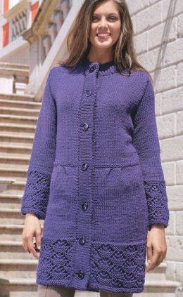 ПАЛЬТО С АЖУРНЫМИ ПЛАНКАМИ вязание спицами 750 г фиолетовой пряжи Mondial Merino Special (50% шерсти, 50% акрила, 79 м/50 г)спицы №5.5 7 пуговиц Двойная...