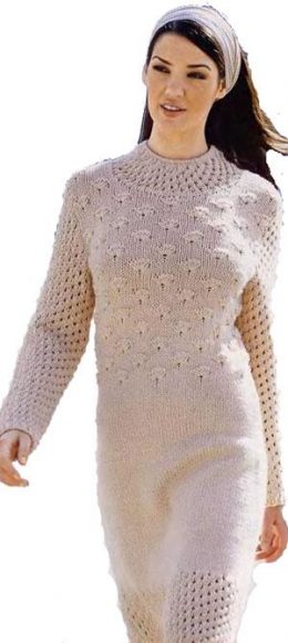 Платье, связанное на спицах и крючком вязаное платье Размеры: 36/38 (44/46) Вам потребуется: 950 (1100) г светло-бежевой пряжи Акопа (50% овечьей шерсти,...
