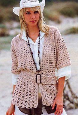 Жакет с поясом Размеры: 36/38 (40/42) 44/46 Вам потребуется: 700 (750) 800 г бежевой пряжи Mondo (52% овечьей шерсти, 48% хлопка, 120 м/50 г); крючок № 4,5; кож...