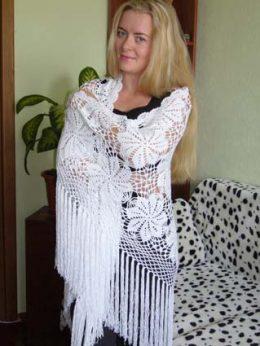 Шикарная белая шаль Для вязания это восхитительной шали Вам потребуется: белая пряжа “Наташа” 500 гр. (50% шерсть, 50% акрил, 250 м/100 г), крючок № 3. В...