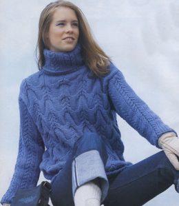 Синий пуловер с косами Размеры: 38—42 Вам потребуется: 700 г синей пряжи (51% овечьей шерсти, 49% полиакрила, 90 м/50 г); прямые и круговые спицы № 5. Резинка:...