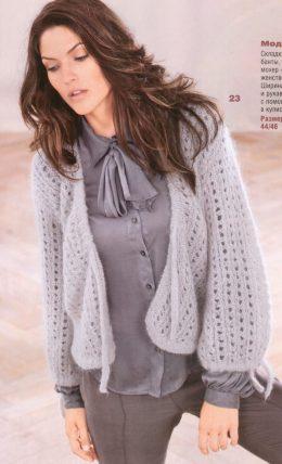 Серебристо-серый мохеровый жакет Размеры: 34/36,38/40 и 42/44. Отличающиеся данные для размеров 38/40 и 42/44 указаны в скобках. Материалы: пряжа (65% мо...