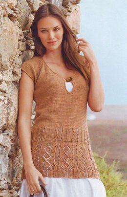 Красивая рыжая туника Размер: 38/40 Вам потребуется: 450 г пряжи цвета нуги (78% хлопка,22% льна, 100 м/50 г), спицы № 4, крючок № 3.5,1 пуговица. Ажурны...
