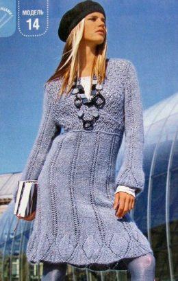 Платье с кокеткой с запахом вязание спицами Размеры: 38/40 (46/48) Вам потребуется: 450 (600) г серой пряжи Merino 150 (100% мериносовой шерсти, 150 м/50 г); 15...