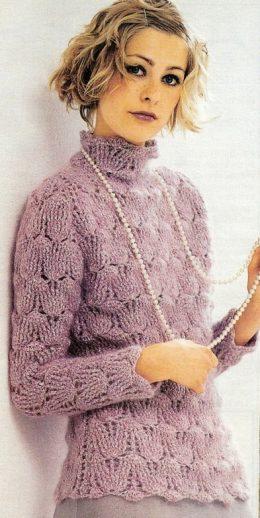 Женский вязаный свитер спицами Женский вязаный свитер выглядит очень романтично и воздушно, благодаря ангорской пряже. Женский свитер прост в исполнении,...