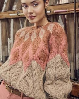 Этот свитер выделяется благодаря уникальному сочетанию текстур: крупные ромбы на плечах и сложные косы в нижней части. Мягкий материал и пастельные тона создают...