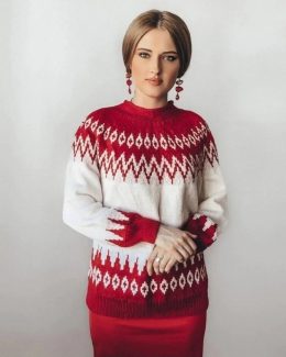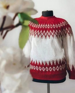 Этот свитер — настоящее произведение искусства, созданное с заботой и вниманием к деталям. Яркое красно-белое сочетание и сложный геометрический узор подчеркива...