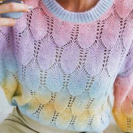 Едва уловимый блеск серебристой нити сплетается с мягкими пастельными оттенками, создавая эффект радуги. Уникальный ажурный узор добавляет легкость и воздушност...