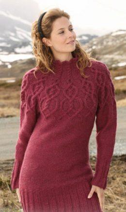Спицами создайте уютный и стильный женский пуловер с уникальными деталями: изысканным ажурным узором по воротнику и рукавам, а также декоративными вставками в в...