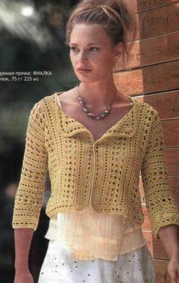 Жакет вязаный крючком Вам нужно 400 г хлопчатобумажной лентовидной пряжи шириной 3 мм желтого цвета. КРЮЧОК №4. Виды петель Воздушная петля (в. п.). Стол...